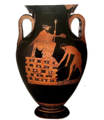 | M.Ö. 500-490 civarına tarihlenen bir vazo resminde Kroisos -kimine göre intahar etmek, kimine göre ise Kyros’un emriyle infaz edilmek üzere- kendisi için hazırlanan odun yığının üstünde. |