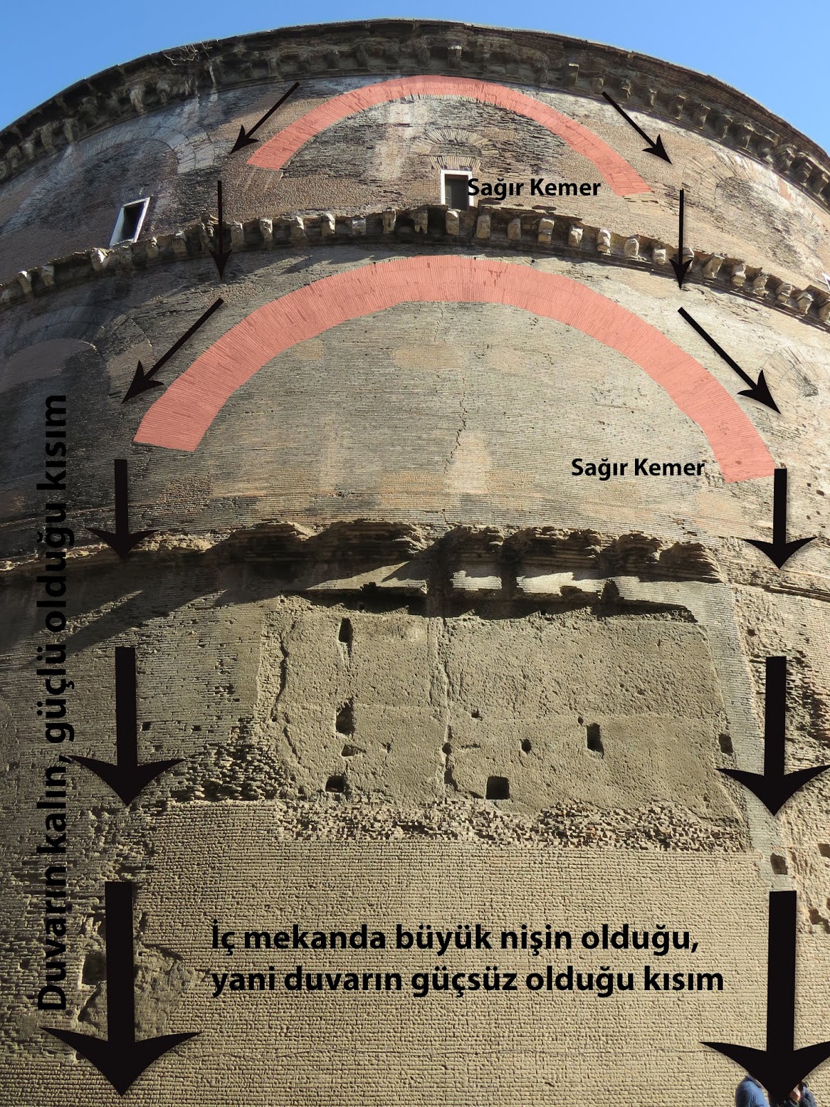 Pantheon’un mimarisindeki statik açıdan en akıllıca strateji yapının ağırlık merkezinin mümkün olduğunca yere yakın, alt kotlarda tutulması çabasıdır. Bir yapının ağırlık merkezi ne kadar yere yakın olursa o kadar sağlam, özellikle deprem gibi yanal yüklere karşı o kadar dayanıklı olur.