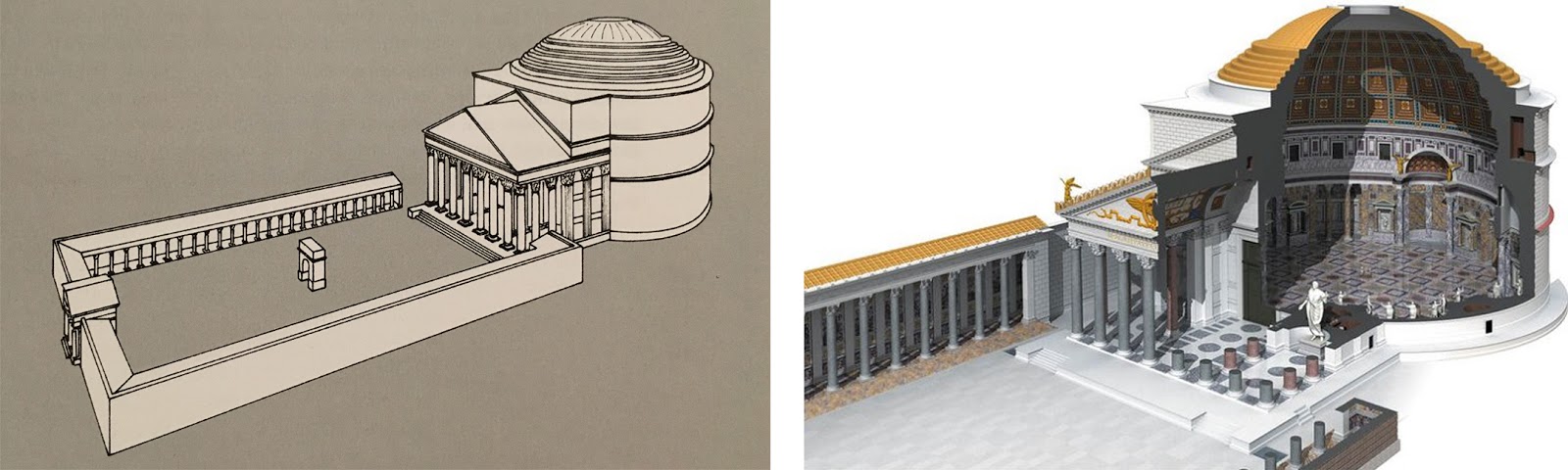 | Solda, Pantheon ve önündeki alanın özgün durumu (Knell, 2013), Sağda, Pantheon kesit perspektifi. (web 4) |