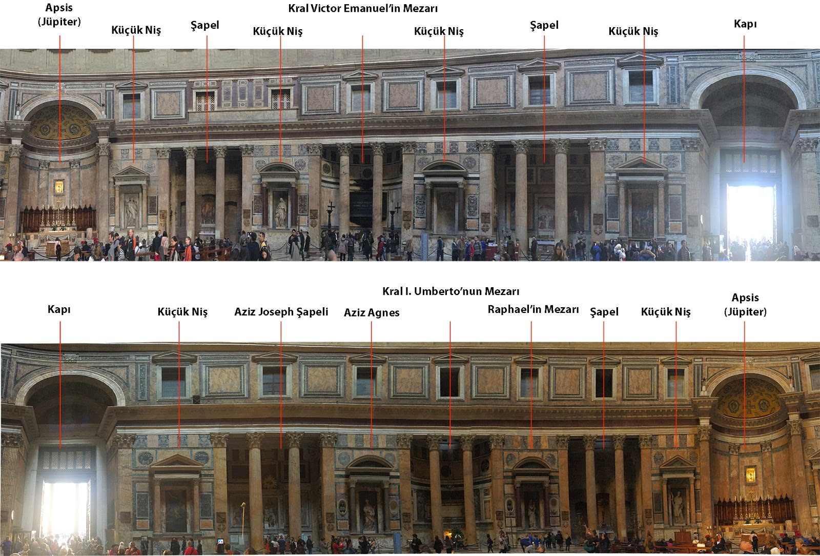 İç mekandaki nişlere gelince… Silindirde simetrik ve sıralı olmak üzere 8 büyük 8 de küçük niş bulunur. Büyük nişlerden biri giriş kapısı diğeri ise kapının tam karşısında, bugün kilisenin apsisi olarak kullanılan ama özgün durumda şüphesiz baş tanrı Jüpiter’e (Yunanlılar’ın Zeus olarak taptıkları) ayrılmıştı. Geriye kalan nişlerde de önde gelen Roma tanrılarının heykelleri ve kült mekanları bulunuyordu. Bugün bu nişlerin bazılarında İtalya tarihinin önemli isimlerinin mezarları bulunuyor. Mihrabın solundaki nişte, bir başka ninja kaplumbağa, pardon, “Rönesans adamı” Rafaello’nun mezarı bulunur. Yandaki nişte ise, 19. yüzyıl Kraliçesi Margherita eşi Kral I. Umberto yatmaktadır. Diğer bir nişte ise İtalya’nın ilk kralı olan II. Vittorio Emanuele’nin mezarı bulunur.
