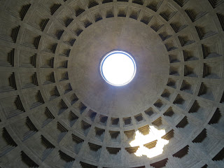 Kubbe ise beton sıvalıdır. Kubbenin tepe noktasında daha önce bahsettiğimiz gibi 9,1 metre çapında, oculus denen bir açıklık vardır. Oculus mekanın tek doğal ışık kaynağıdır ve gün boyunca buradan giren güçlü güneş ışığının duvarlarda ve kubbe yüzeyinde gezinmesi gerçekten de çok etkileyici bir sahne yaratır. Aynı zamanda hava sirkülasyonu da sağlayan oculustan dedikoduların aksine yağmurlu günlerde bittabi yağmur damlaları girmektedir. Bu suyun mekandan uzaklaştırılması için bir drenaj sistemi bulunur. Ben ne yazık ki denk gelemedim ama yağmurun, özellikle de kar tanelerinin mekanda süzülüşünü izlemenin müthiş bir deneyim olduğu söylenir.