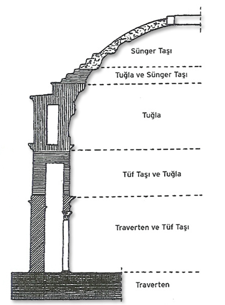 Yapının büyük kısmını oluşturan silindirik kütlenin neredeyse tamamen tuğladan oluştuğunu söylemek mümkün. Bu cephenin orijinal durumda da kaplamasız olup olmadığı tam net değil. Bazı kaynaklar mermer veya sırlı tuğla kaplamalardan söz etse de bu kaplamalara dair bir iz cephelerde görünmüyor. Bu sayede aslında Romalıların yük dağılımı ve yüklerin yönlendirilmesi konusunda ne kadar ustalık sahibi olduklarını da görüyoruz. Silindir duvarın içindeki sağır (içi kapalı) kemerlerle yükler duvarların kalınlaştığı yerlere aktarılarak yapının statik dengesi güçlendirilmiş.