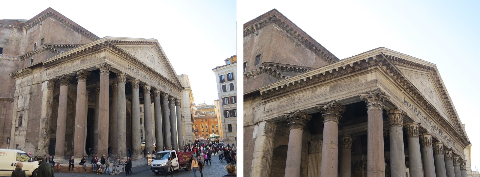 Sütunlu kısım, ya da ön-portik, ilk sırada, yani cephede 8 tane olacak biçimde, 2. ve 3. sıralarda ise 4’er tane olmak üzere Korint düzeninde toplam 16 bağımsız sütundan oluşuyor. Bu sütunlar hakkında biraz bilgi vermek gerekirse, her biri en azından 60 ton gelen yivsiz, monolitik gövdeleri Mısır’dan getirtilmiş Asuan granitinden (Knell, 2013). Korint düzeni sütun başlıkları ise kireçtaşından oyulmuş. Bu kısım aslında Romalıların büyük oranda Yunanlılardan aldığı ve bir miktar Etrüsklülerin tapınakları ile melezlediği klasik bir Roma tapınağı cephesi mahiyetindedir. Bununla birlikte asıl dikkat çeken şeyse sol sıradaki 3 sütun başlığının sofistike bezemesinin yanında diğer 13 bağımsız sütun başlığı ile duvara bitişik 4 ayağın başlığının oldukça kaba işlenmiş olması. İçeride de Korint düzenindeki özenli sütunların devam etmesi konuyu daha da karışık hale getiriyor. Böyle olunca özensiz sütunlar azınlıkta kalıyor. Kimbilir, belki de bunlar, daha erken tarihli bir yapıdan devşirilmişlerdir…