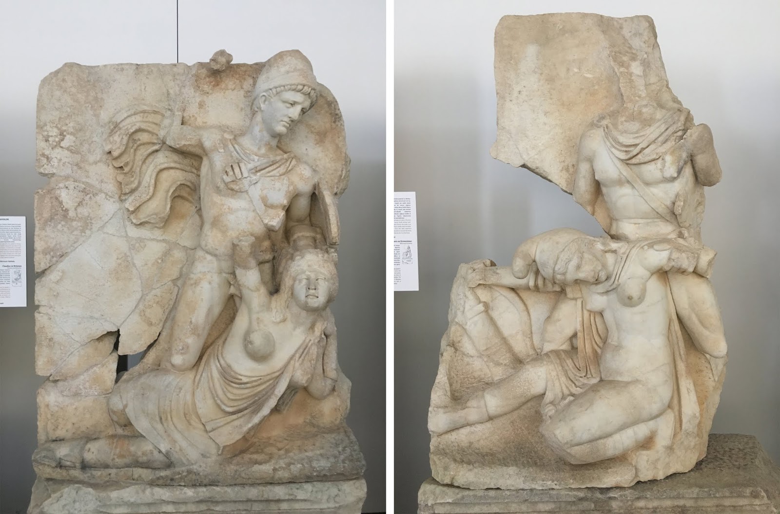 | Aphrodisias Müzesi’ndeki Akhilleus ve Penthesilea heykel ve rölyefi. |