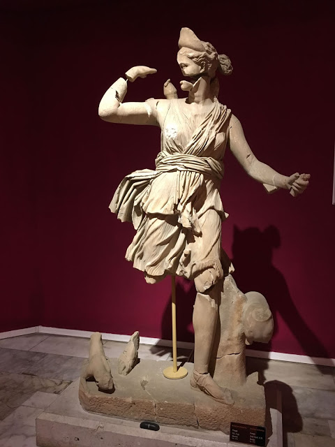 Artemis benzer yine bir av esnasında, bir pozda. Sol elinde yayı, diğer eliyle sadağından ok alırken