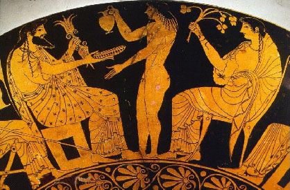 Arkaik döneme ait bir vazo resminde Zeus, Ganymedes ve Hestia. Zeus, tahtta oturmasından ve asasından belli olurken