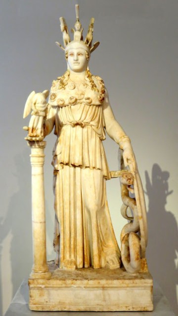 Başında miğferi, göğsünde Medusa başı, bir elinde kalkanı ve kutsal hayvanı, diğer elinde ise