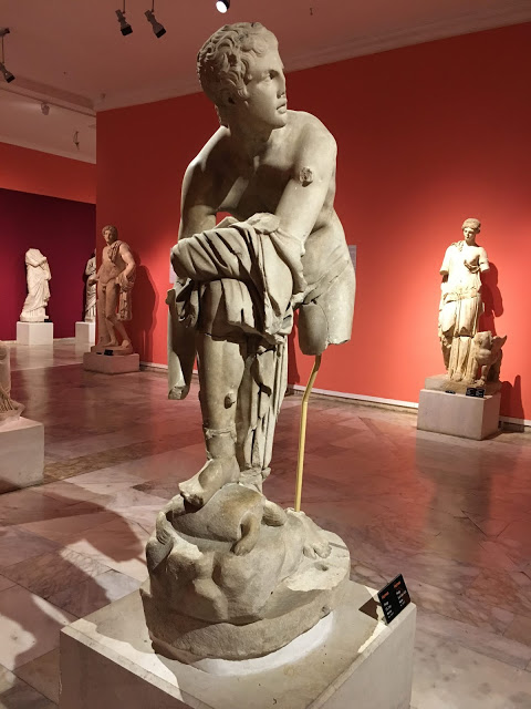 Antalya Arkeoloji Müzesi’ndeki bu Dyonisos’ta atribu olarak daha önce kendisi ile ilgili bir mittte