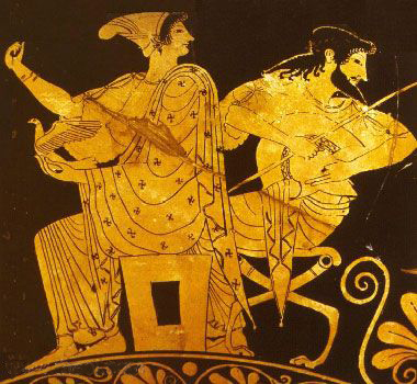 Ares ve Aphrodite’i birlikte gösteren Arkaik döneme ait bir vazo resmi. Yalnız Aphrodite’in de kocası Hephaistos’tan