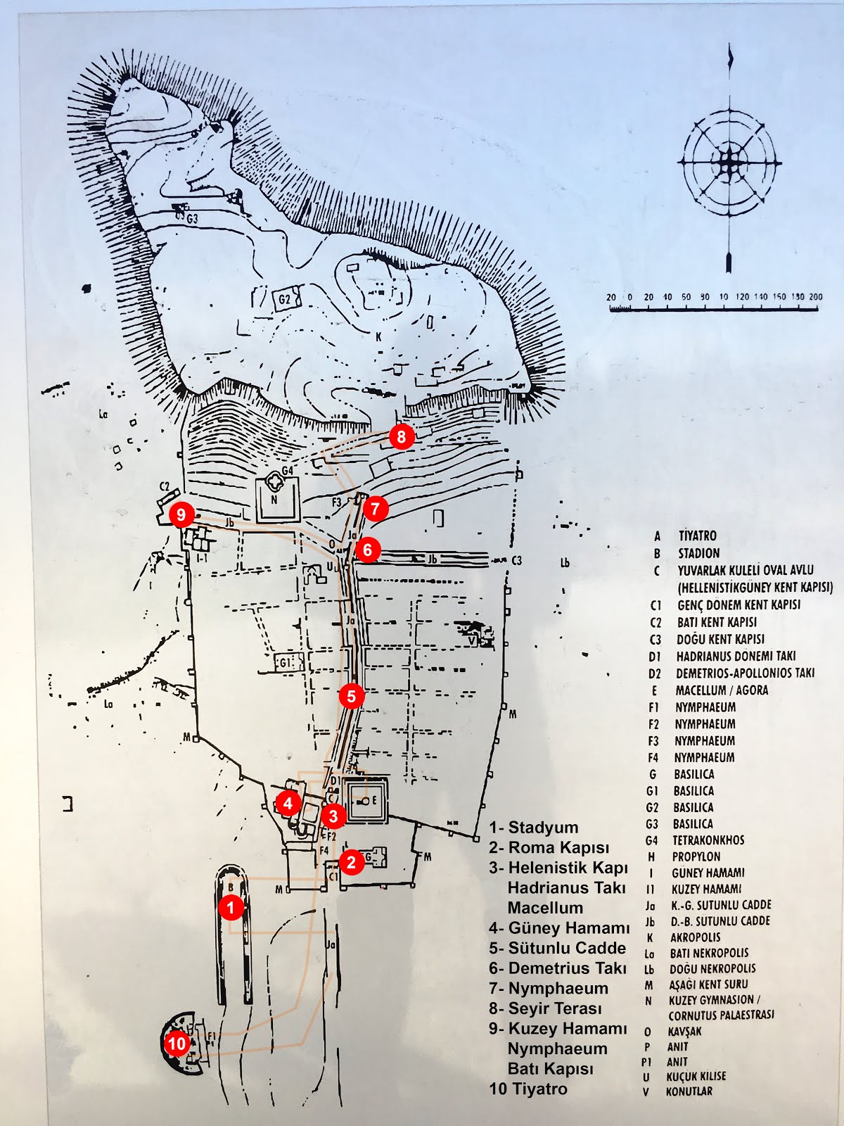 | Perge Kent Planı (Bilgilendirme tabelasından) ve önerdiğim gezi güzergahı |
