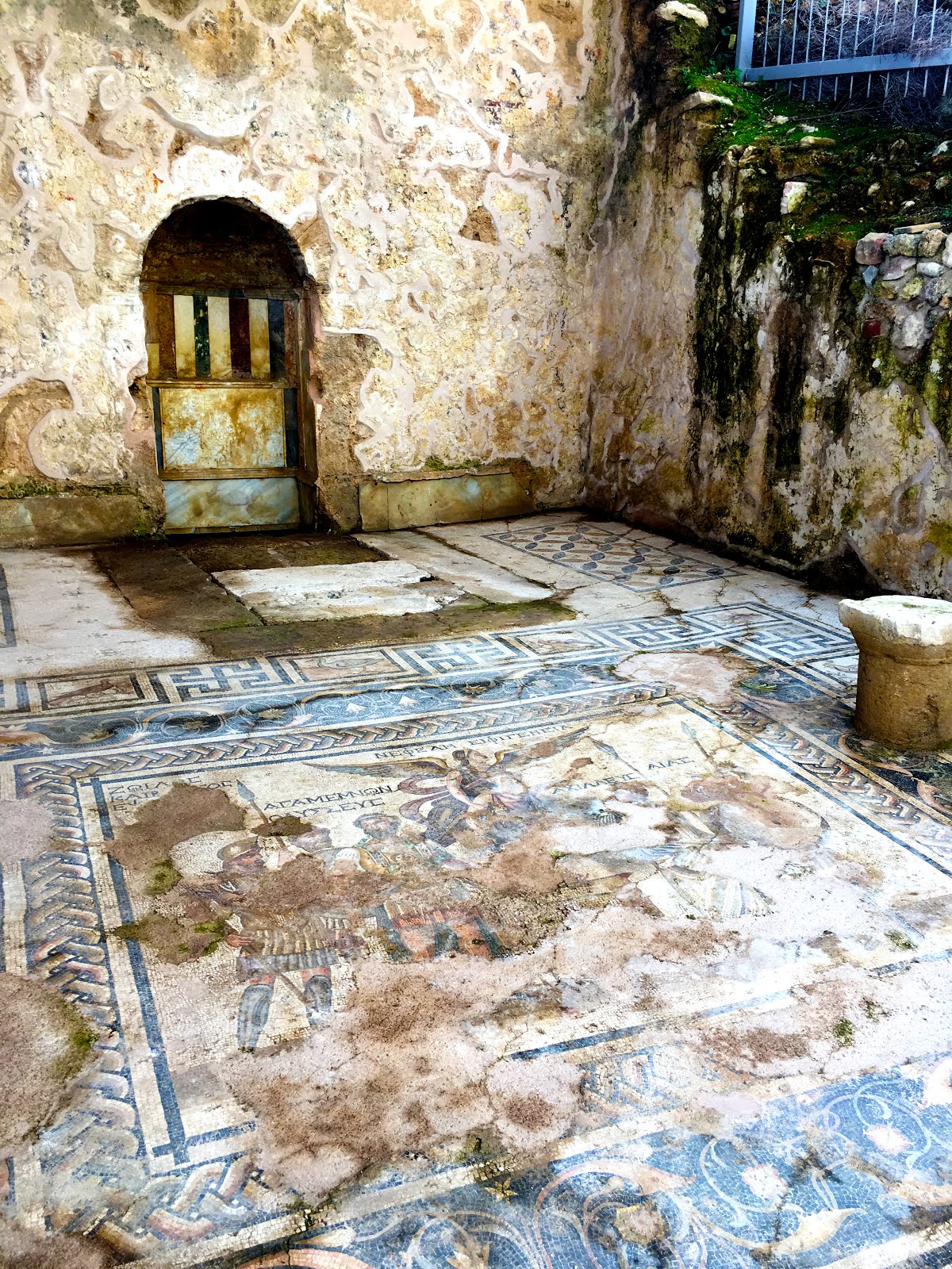 Batı hamamına doğru giderken sol koldaki mekanlardan birisinde özel, mozaikli bir zemine rastlanmış. Mozaikler açığa çıkarıldıktan sonra zarar görmemeleri için demir bir parmaklıkla kapatılmış mekan. Bilgilendirme tabelasında şu bilgiler aktarılıyor:
