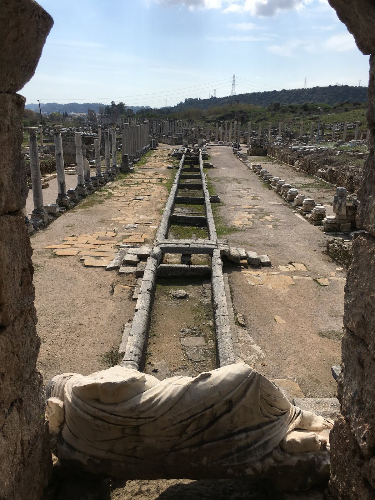 Perge’nin en görkemli yanlarından birisi de, kentin içinde birbirini kesen son derece geniş, iki tarafı dükkan sıraları ve sütunlu yarıaçık mekanlarla, bazen ortasında bazense bir yanında su akan müthiş bulvarları.