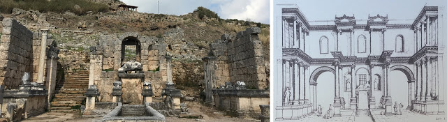 | Nymphaeum’un şimdiki hali ve restitüsyon çizimi. |