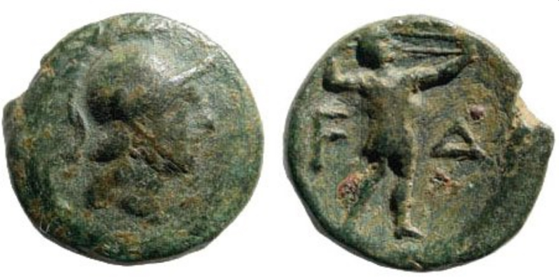 | MÖ 300-200 civarına tarihlenen bu sikkede ise bir yüzde miğferi ile savaşçı Athena tasvir edilirken diğer yüzde sapana benzer bir silahla atış yapan bir savaşçı var. |