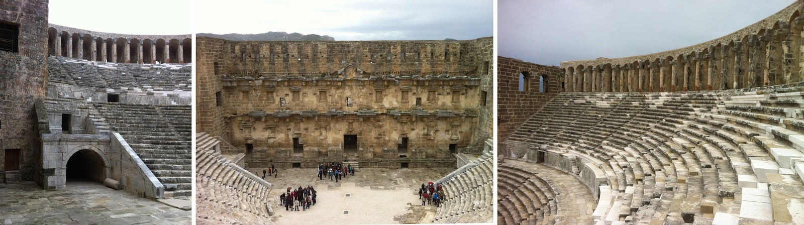| Tiyatrodan görüntüler. Solda tonozlu paradustan orkestra’ya çıkış, ortada orkestra ve sahne, sağda cavea, yani oturma sıraları ve üstündeki auditorium. |