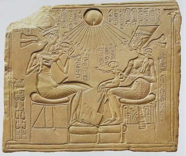 | Akhenaton karısı Nefertiti ile birlikte gösteren ünlü stel. Güneş Tanrı Aten’in ışınları onlara merhametle uzanıyor. Kaynak: web1 |
