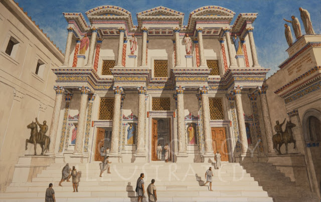 | Celsus Kütüphanesi ön cephesinin güzel bir restitüsyonu (Görsel: web1). |