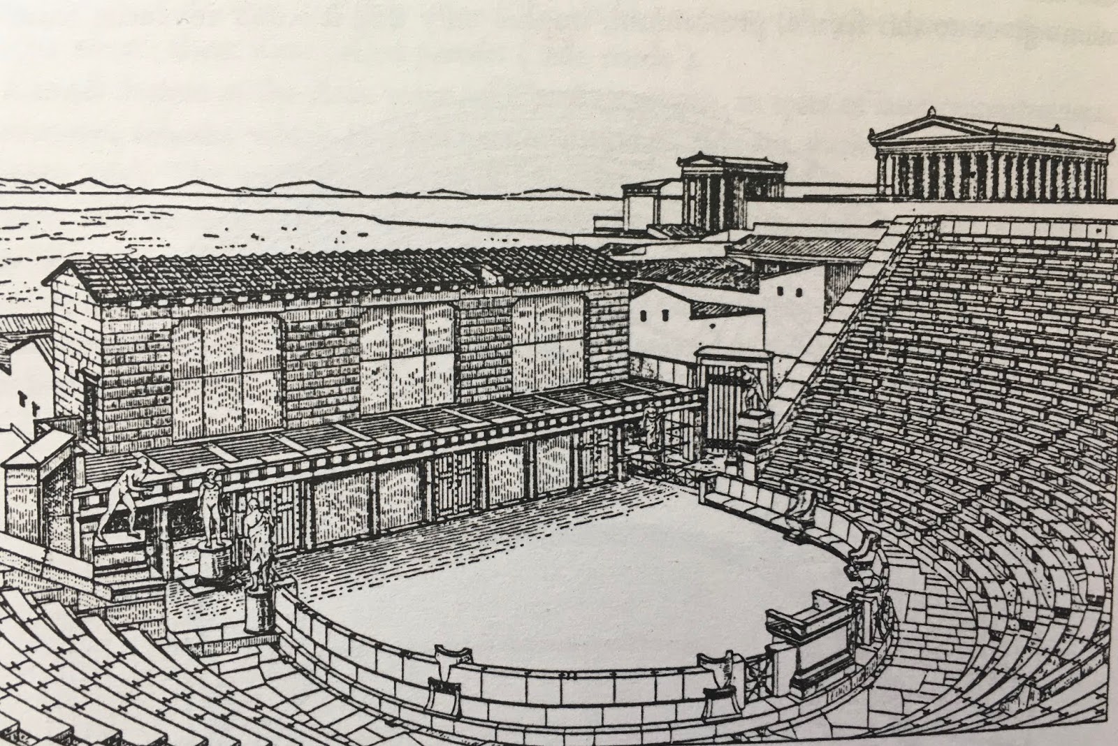 Aşağıda Atina Akroplünün hemen eteğindeki Dionysos tiyatrosunun henüz taş sıralara kavuşmadığı MÖ 5. yüzyılın ortasındaki ahşap halini görüyorsunuz.
