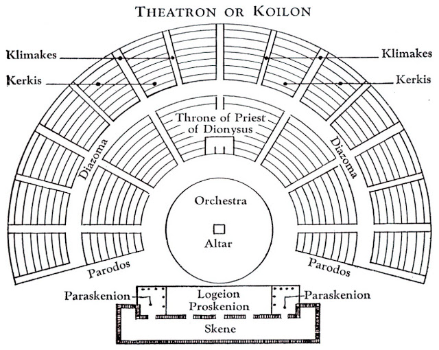Bu arada şu orkestra meselesine de bir değinelim. Orkestranın Yunan tiyatrosundaki anlamı bugünkünden farklıdır. Yunan tiyatrosunda önceleri performansın büyük kısmını gerçekleştiren KOROnun bulunduğu erken dönemlerde daire daha sonra yarım daireye küçülen alana orkestra deniyordu.