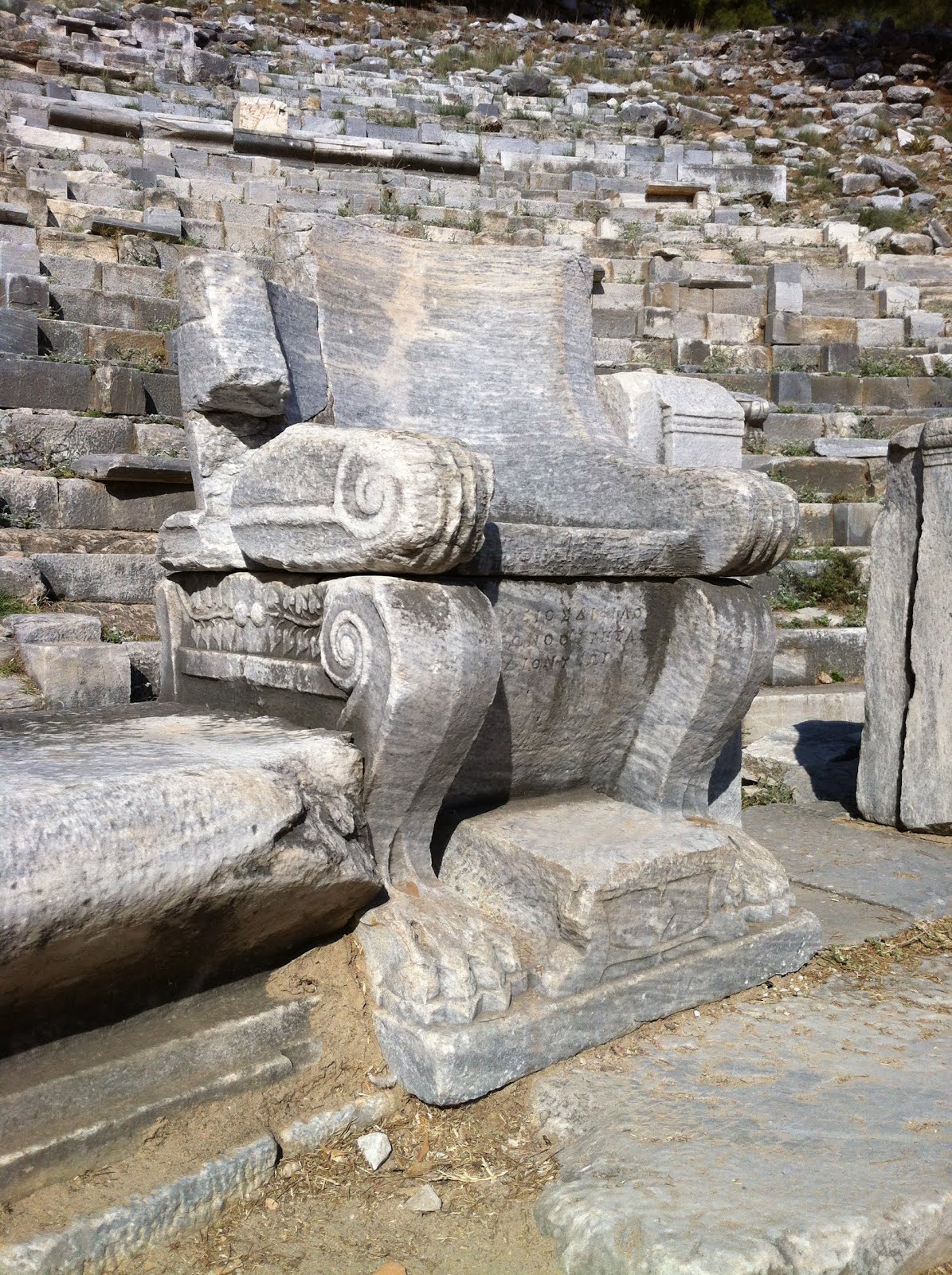 | Priene Tiyatrosu’ndan en önde özel koltuk. Büyük olasılıkla Dionysos rahiplerine ayrılmıştı. |