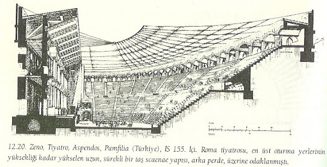 | Aspendos Tiyatrosu sahne kesiti ve üst örtü sistemi (Roth, 2000). |