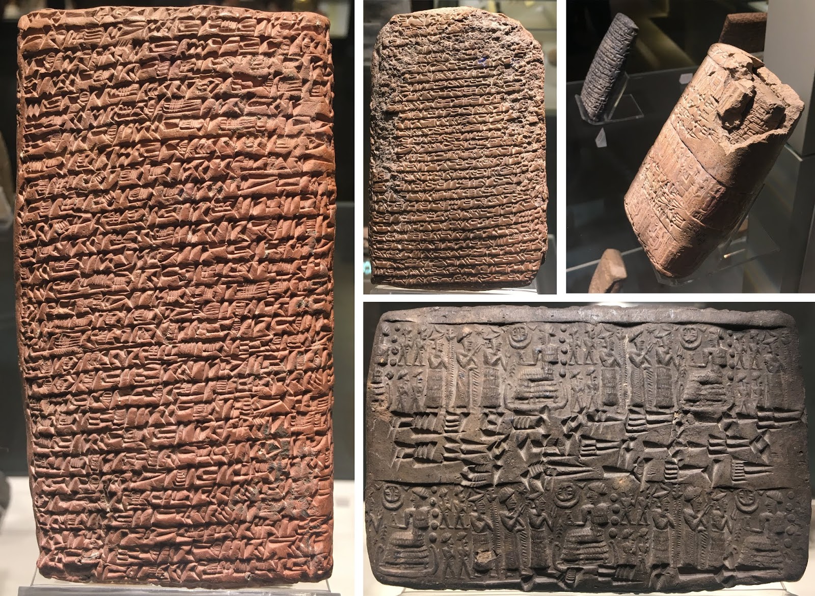 Sağ üstteki örnek de çok ilginç. Bir tableti yine kilden bir zarfın içinde görüyoruz. Zarfın üstünde de yazılar var. Sağ alttaki örnekte de aynı tablette hem çivi yazısı hem de hiyeroglif birarada kullanılmış.