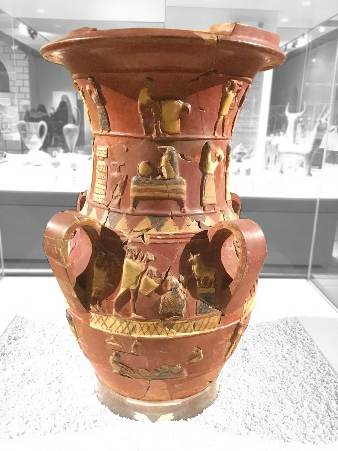 Neyse, Anadolu şovenizmi damarımızı sakinleştirip esere dönelim. Fotoğraftan çok ölçekleyemiyosunuz belki ama oldukça yüksek, 82 cm. yüksekliğinde bir seramik kap bu. Tabi bu kadar müthiş bir eserin alelade bir kullanımı olmasını düşünmek pek mümkün değil. Olasılıkla kutsal törenlerde kullanılan, belki kutsal bir içeceğin sunulduğu bir kaptı bu.