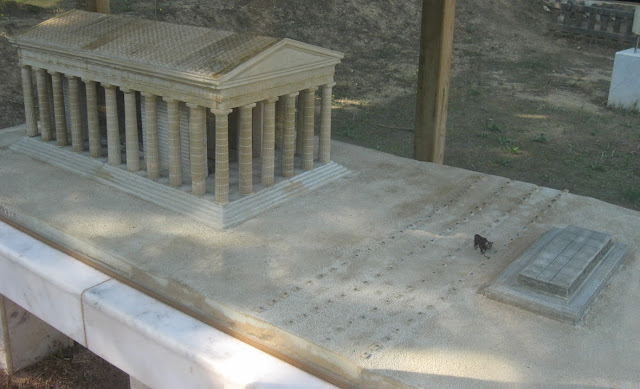 | Klaros Apollon Tapınağı’nın maketi. Tapınağın hemen önünde “Hekatomb” denen kurbanlıkların bağlandığı alan ve onun da önünde sunak. |