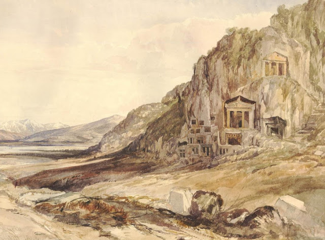 | Gordios Telmessos yollarında… Suluboya resim: “Tomb of Amyntas”, 1843, William James Müller. Kaynak: web8. |
