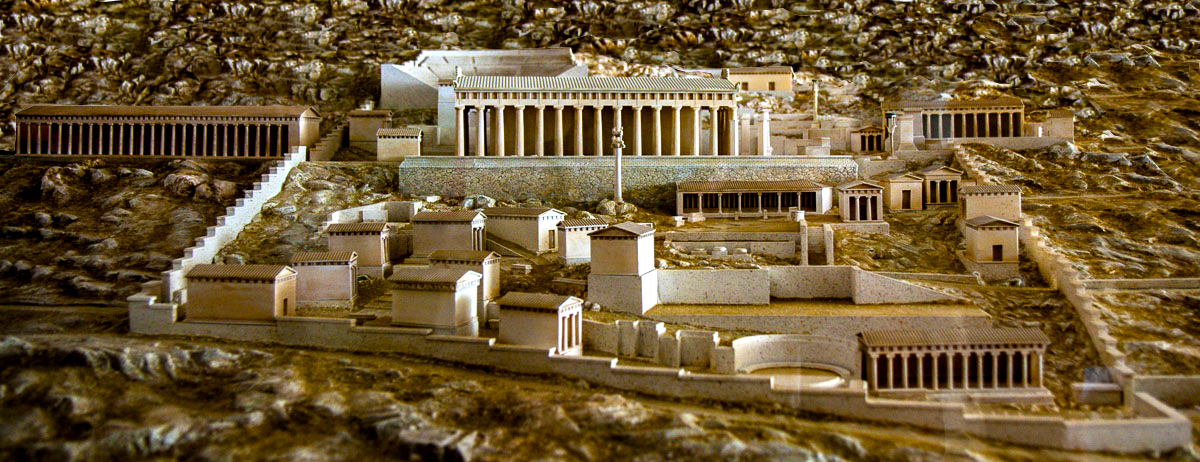 | Delphoi’deki Apollon Tapınağı. Arkada Tiyatro, önde hazine binaları ile… (Kaynak: web4) |