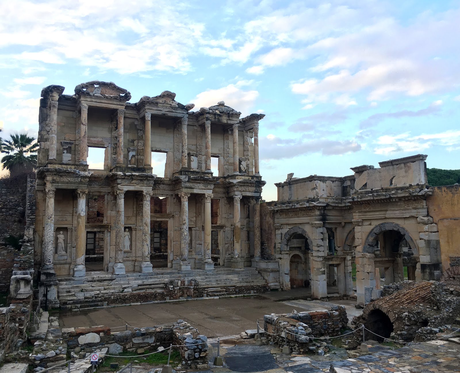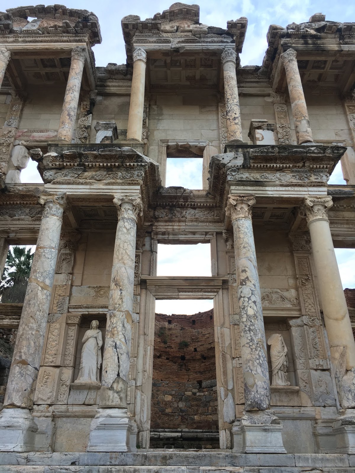 The Library of Celsus is beyond doubt one of the most known and iconic structures of the ancient Ephesus. The library is located at the corner of the intersection of Kuretler Street and Mermer Street,the front facade of the library,which was raised with the works that lasted between 1970-78, has an extraordinary beauty with its eye-catching decorations and especially the 4 female statues in the niches. After touching up on the history of the library, I intend to dig deeper and explore the facade and sculptures within.