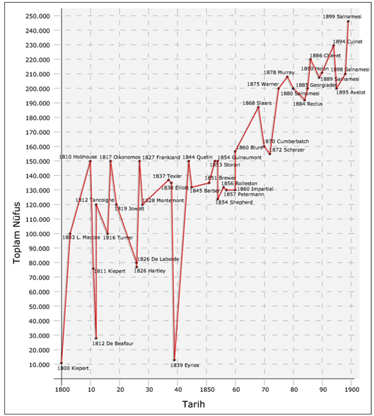 İmparatorluktaki genel eğilimlerin 19. yüzyıl İzmir’inin demografisinde ne kadar karşılık bulduğunu değerlendirmek için yeterli güvenilir kaynağın bulunduğunu söylemek güçtür. Yüzyılın sonuna doğru sayıları artan salnamelere gelinceye kadar bu bağlamda en önemli kaynaklar gezginlerin aktarımlarıdır. 19. yüzyılın ilk yarısında birçok gezgin İzmir’e uğramış ve nüfus tahmininde bulunmuştur. 1880, 89, 98 ve 99 Aydın salnamelerdeki nüfus rakamları ise özellikle kentin yüzyılın sonlarına doğru olan demografik durumunu yansıtan, görece olarak daha güvenilir kaynaklardır. Ancak yine de imparatorluğun çözülme sürecine girdiği ve milliyetçilik akımlarının güçlenmeye başladığı bu yüzyılda gerek gezginlerin gerekse resmi belgelerin aktardığı nüfus rakamlarının ne derecede güvenilir oldukları tartışma konusudur. Rumlar ve Ermeniler gibi yerel unsurların bağımsızlık niyetlerini gittikçe daha açıkça ifade etmeleri ve bu taleplerinin meşruluğunu nüfus oranlarında aramaları, imparatorluğun resmi belgelerinin de doğal olarak tam tersi bir eğilimle hazırlanmış olma olasılıkları eldeki verilerin tarafsızlığına olan güveni azaltmaktadır. Bu yüzyılda İzmir’de bulunan gezginlerin tarafsız olacağı düşünülebilirse de tahmin ve sınırlı gözleme dayanan bu aktarımların ne derece sağlıksız olduğu bir yana, Osmanlı İmparatorluğu’nun, gezginlerin geldiği devletlerle olan ilişkileri de gezginlerin tarafsızlığına gölge düşürmektedir. Nitekim bu gezginleri bazılarının gayrimüslim nüfusu birçok yerleşmede abartarak vermesi, 19. yüzyıl sonlarında gelişen, Osmanlı İmparatorluğu’nu bölüşme isteğini yansıtan politik bir anlayıştan kaynaklanır (Göksu, 1994). Bununla birlikte dönem aktarımlarıyla oluşturulan grafik tüm bu belirsizliklere rağmen nüfusun genel seyri bağlamında bir fikir vermektedir (Şekil 1).