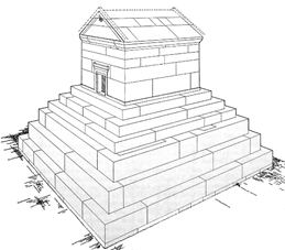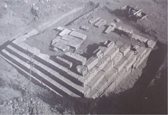 Bu tipolojinin farklı bir versiyonu yine inşa tarihi ve aidiyeti tartışmalı bir başka mezar anıtı olan ve “Piramit Mezar” olarak anılan yapıdır. Sözkonusu yapı, Lidya Uygarlığı’na başkentlik yapmış ve Pers işgalinden sonra da önemini korumuş olan Sardes’de, kentin akropolisinin batı yamacında yer alır. Yapının sadece basamaklı podyum kısmı sağlam olarak günümüze gelebilmiştir. Üstyapıya ait hemen hiçbir izin bulunmaması yapının özgün durumuna değin farklı önerilere neden olmuştur. Ancak önerilerin uzlaştığı nokta, basamaklı bir piramiti andıran podyumun üzerinde içinde mekan barındıran simgesel bir yapının bulunduğudur (Resim 3-4).