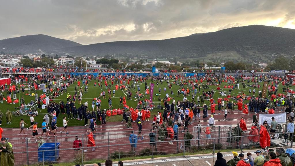 Pazar sabah 5:00 gibi kalkıp hazırlanıp Sintagma Meydanı’ndan kalkan servislerle yarışın başlayacağı yer olan Marathon kasabasındaki spor sahasına geldik. 7:00 gibi oradaydık ama bizim grubun startı 10:10 da verilecekti. 3 saatin üstünde bekledik. Gerçi kalabalık bir grup olduğumuzdan sohbet muhabbet çok sıkılmadık ama tek başıma olsam çok sıkılırdım herhalde. Etrafta baya renkli koşucular vardı. Pheidippides gibi ya da Antik Yunan askeri gibi giyinen vs… İnsanların bazıları aylarca antrenman yapıp ciddiyetle katılırken bazıları da sosyalleşmek, eğlenmek için katılıyor bu yarışlara. İkisi de makul bence.