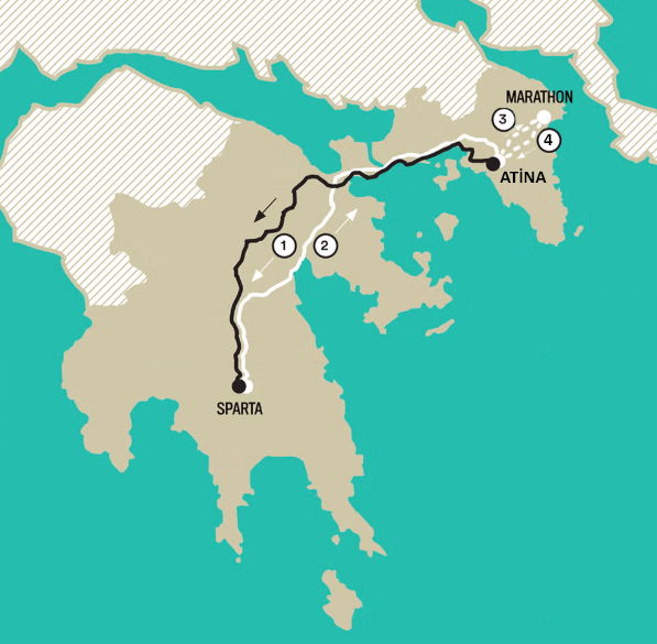 Pheidippides nerdeyse hiç durmadan Atina’dan Sparta’ya kadar koşup (yaklaşık 250 kilometre) Spartalılara durumu iletiyor (Görselde 1) ve onlardan aldığı yanıtı (valla bizim kutsal günlerimiz başladı, o günler bitmeden gelemeyiz) tekrar koşarak Atina’ya götürüyor (Görselde 2).