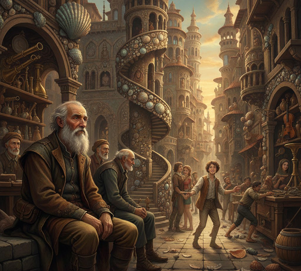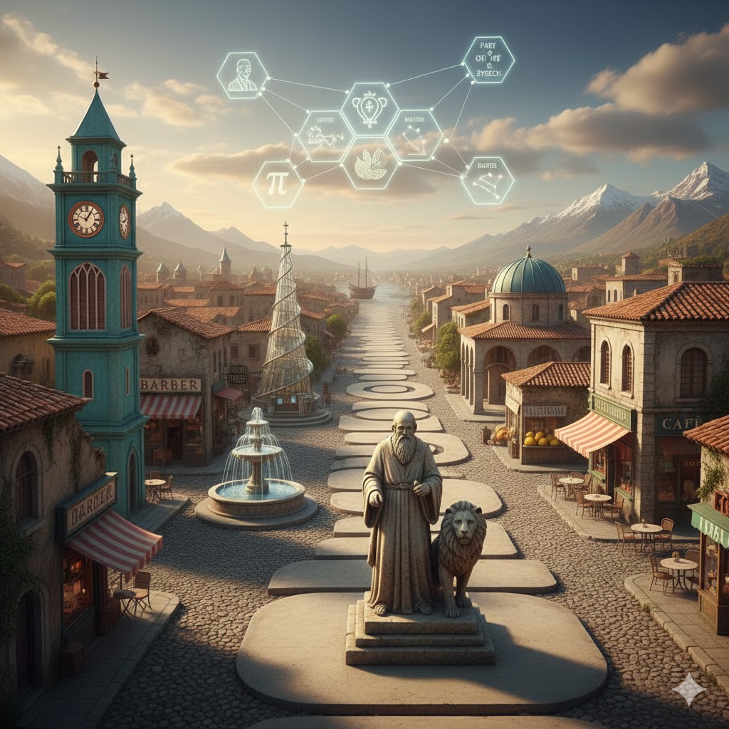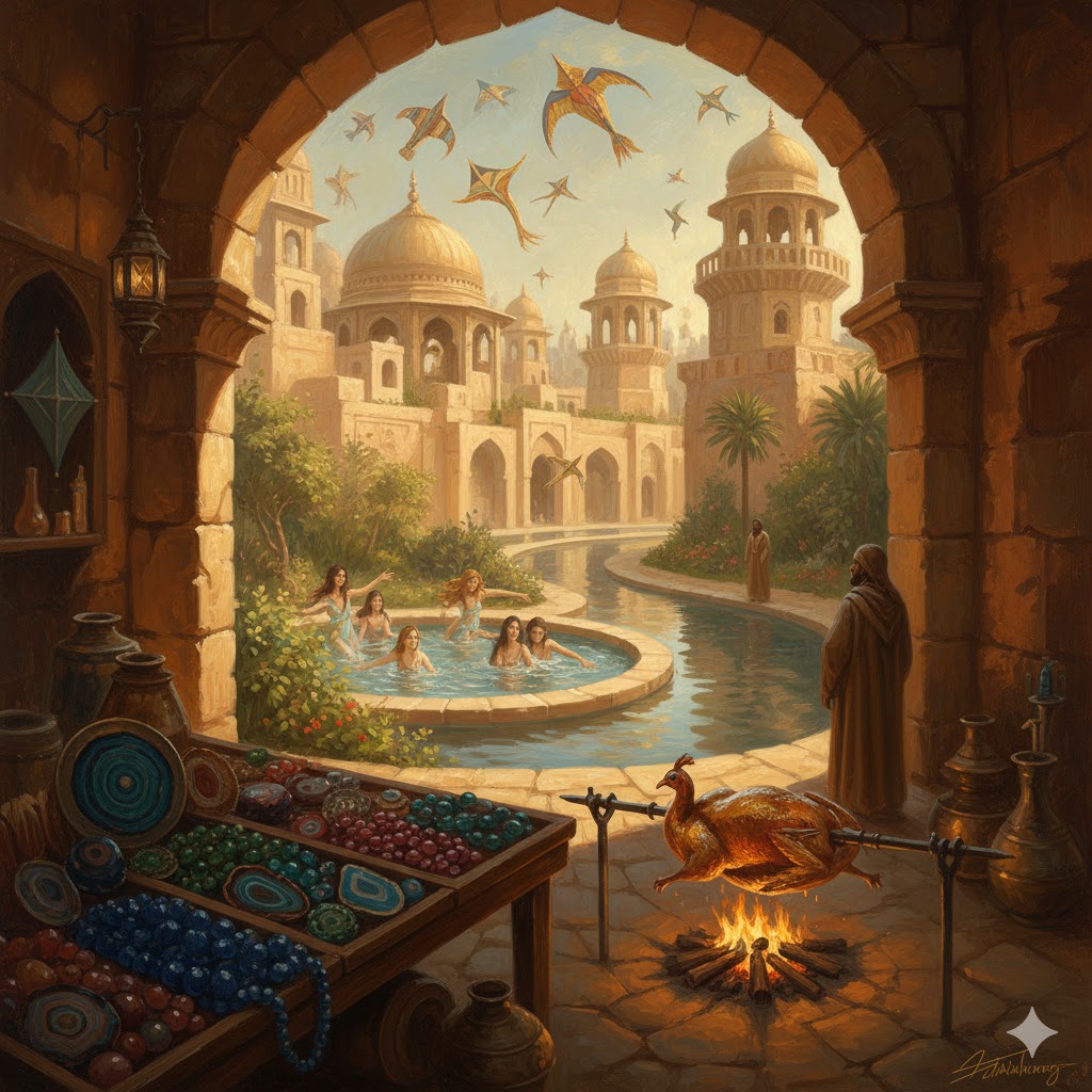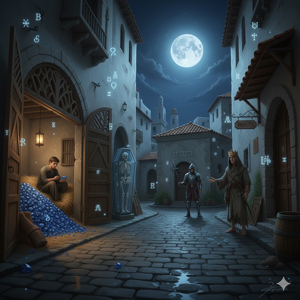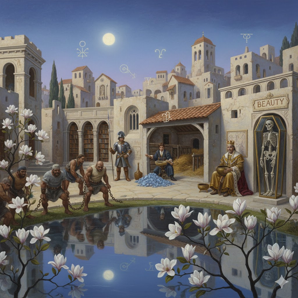 “No matter how far you travel, at some point you will reach Hypatia, a city where the language is composed not of words, but of things. Upon entering, the traveler sees a magnolia garden reflecting in a blue lagoon, yet instead of lovers, they find fierce prisoners clanking their chains. Seeking a philosopher, the traveler is directed to a stable where a youth is counting diamonds, while a library is guarded by a captain of the guards. Even the most basic signs are inverted; a traveler wanting to see a beautiful woman finds instead a skeleton in a glass coffin, and a beggar asking for alms is actually a prince in disguise.