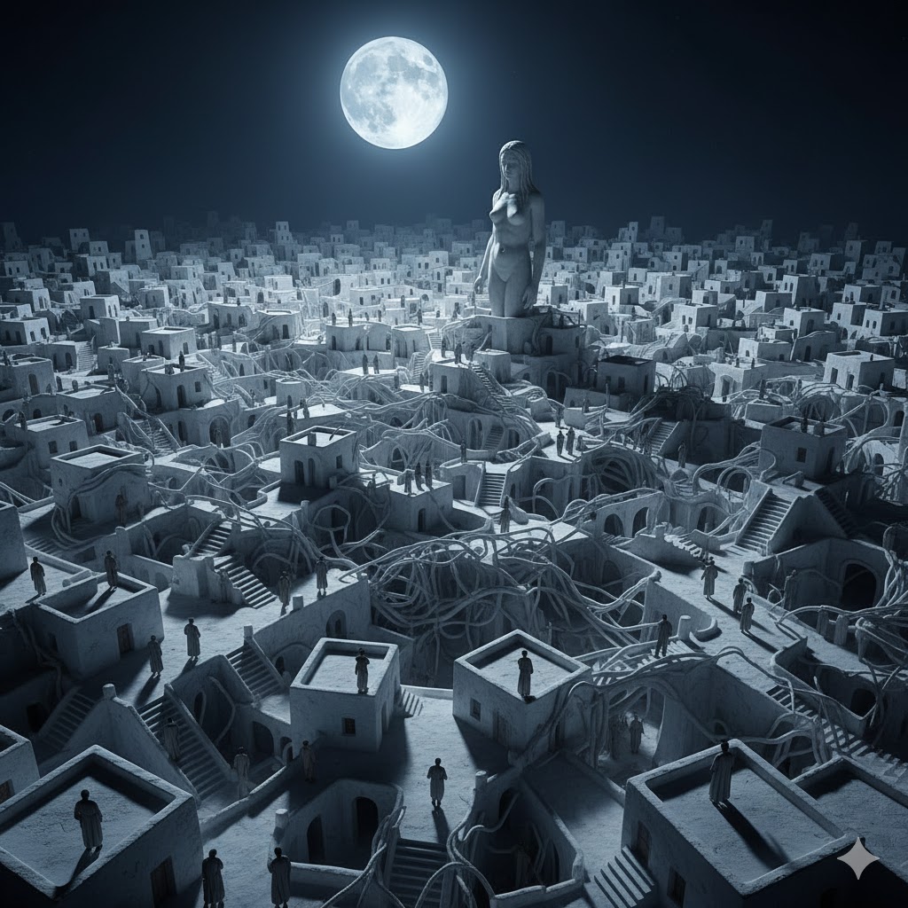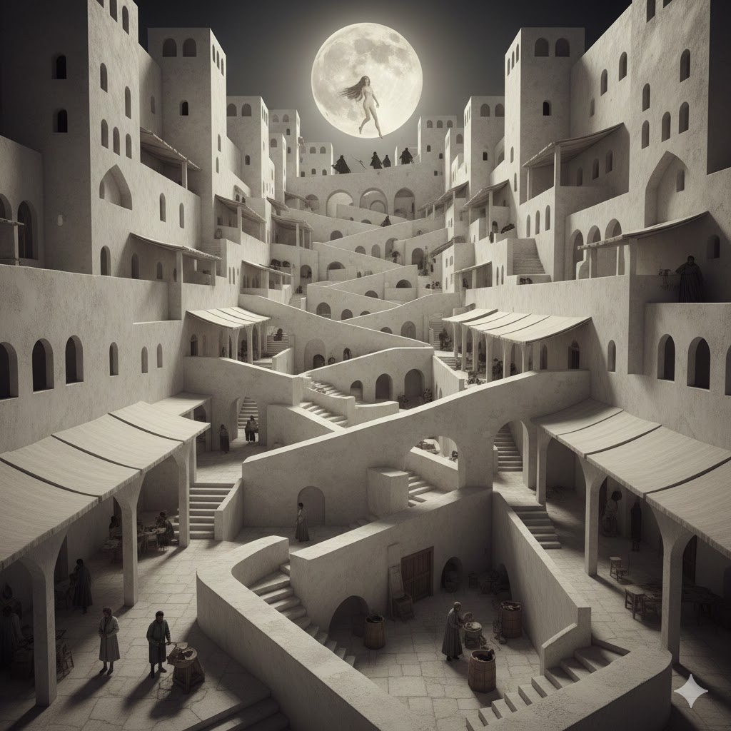 Later, new men arrived who had experienced the same dream. Recognizing elements of their dream in Zobeide, they constantly altered the city’s arcades and stairways to more closely resemble the path of the pursued woman, hoping to eliminate any avenue of escape. To the original inhabitants, who no longer remembered the dream, it was impossible to understand what drew these newcomers to such an ugly city, which had become nothing more than a trap.”