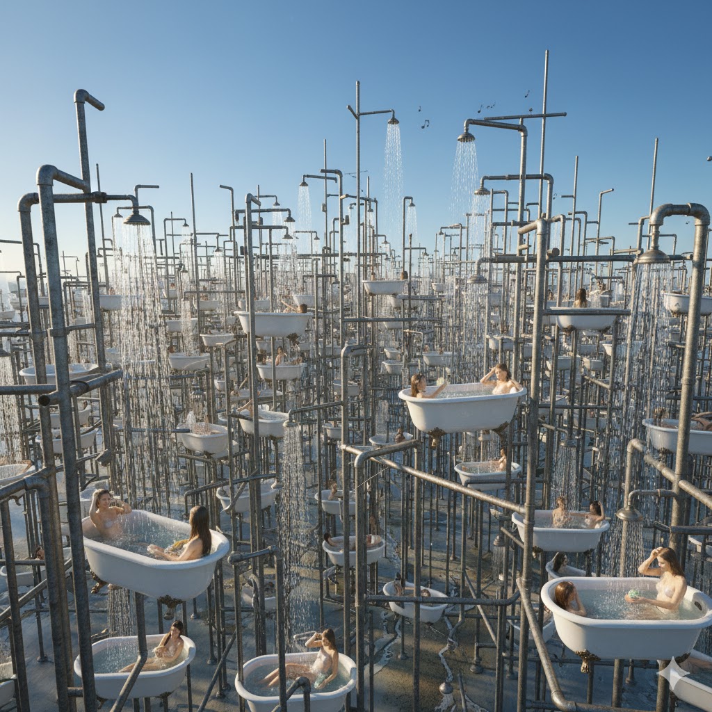 “Whether Armilla is unfinished or has been demolished due to an enchantment or a whim remains unknown, but the city notably lacks walls, ceilings, and floors. It consists entirely of a forest of water pipes that rise vertically where houses should be and spread out horizontally where floors should be, ending in various taps, showers, and spouts. Against the sky, white porcelain bathtubs and lavabos stand out like late fruit hanging from boughs, giving the impression that plumbers finished their work before bricklayers arrived, or that these indestructible hydraulic systems survived a great catastrophe. Despite its appearance, Armilla is not deserted; at any hour, one can glimpse slender young women luxuriating in bathtubs or arching their backs under showers suspended in the void. In the sunlight, the water from the showers and taps glistens alongside sponges’ suds as these women wash, perfume themselves, or comb their long hair.