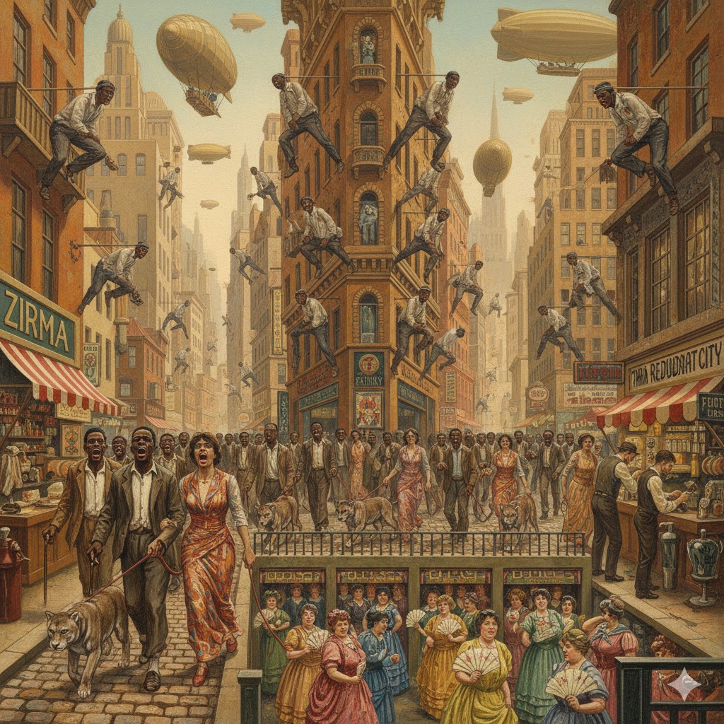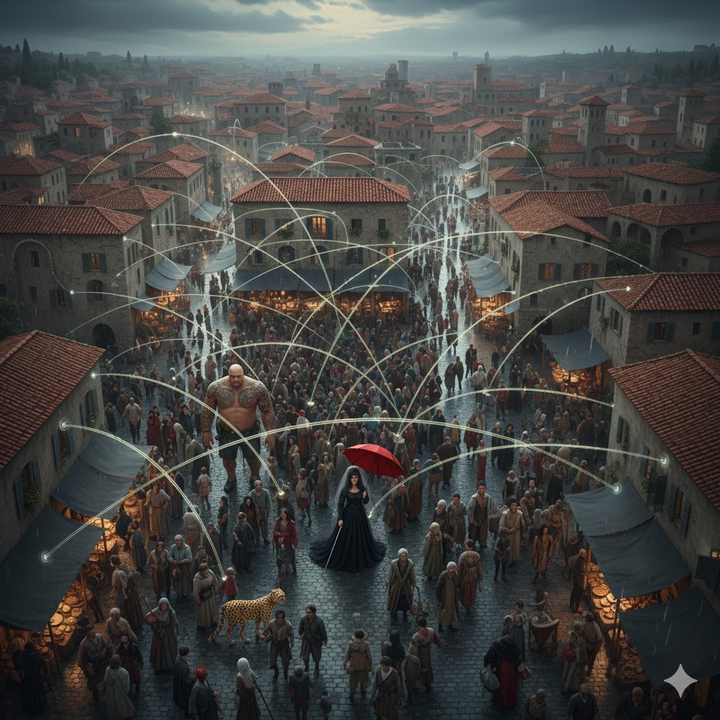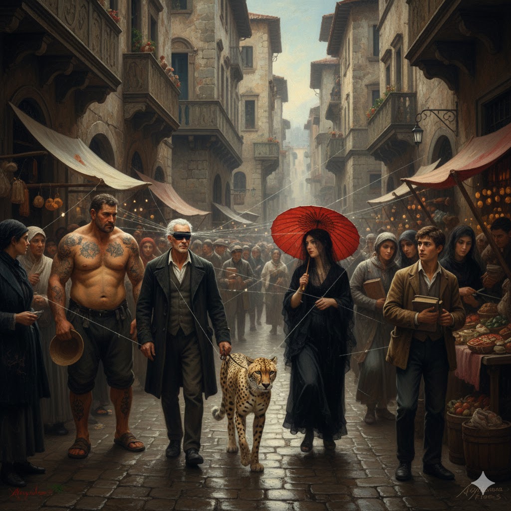 “In the great city of Chloe, the streets are filled with people who remain total strangers to one another. At every encounter, they imagine a thousand possible interactions—conversations, surprises, or caresses—yet no one actually offers a greeting. Their eyes lock for a mere second before darting away to seek new targets, never lingering. The crowd is a diverse mosaic of figures: a girl twirling a parasol, a restless woman in black behind a veil, a tattooed giant, a young man with white hair, and even a blind man leading a cheetah on a leash. An invisible exchange of glances connects these figures like geometric lines, exhausting all possible combinations in a single moment.