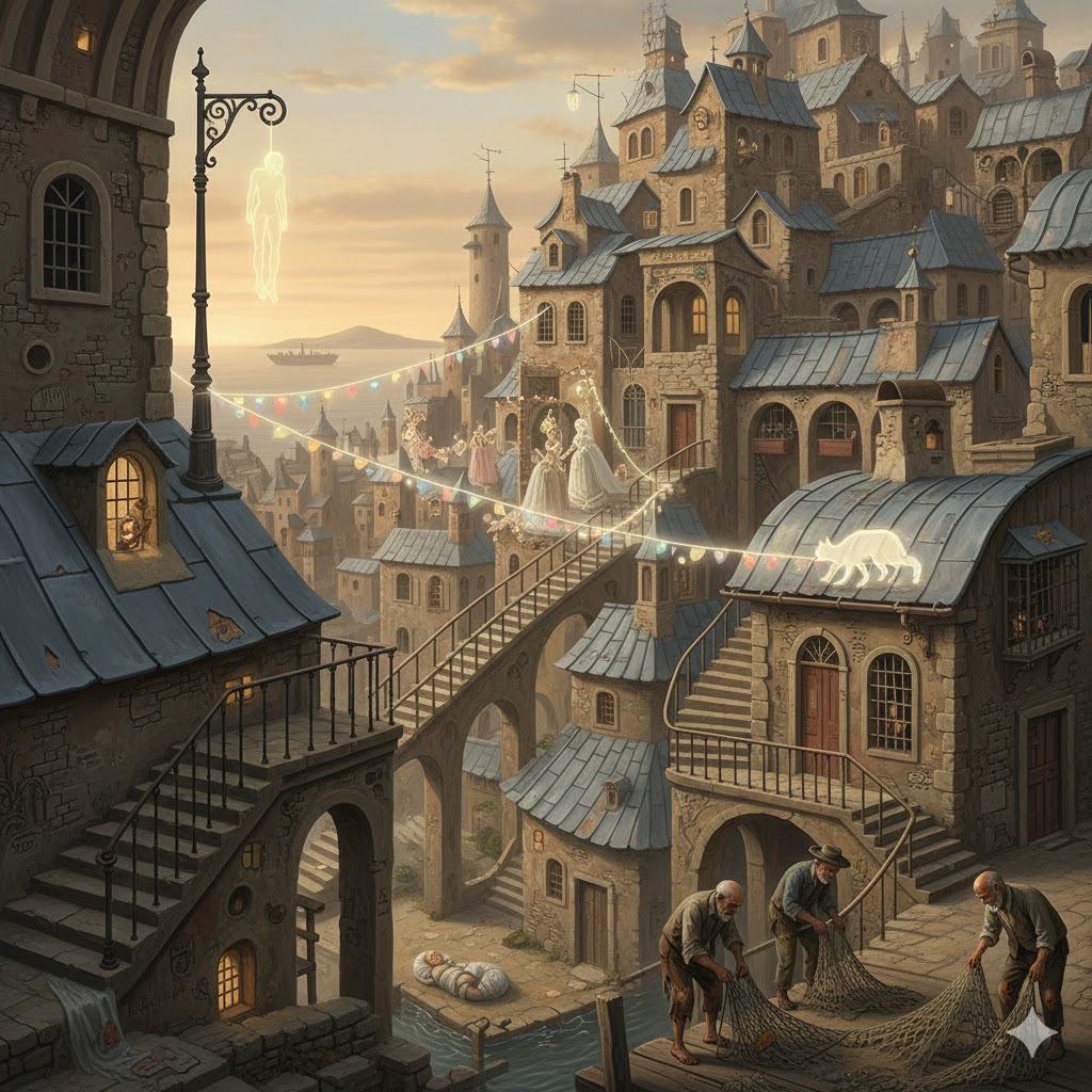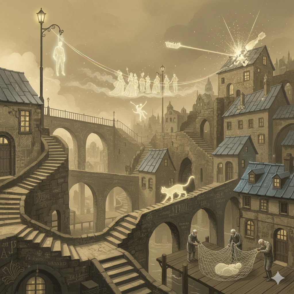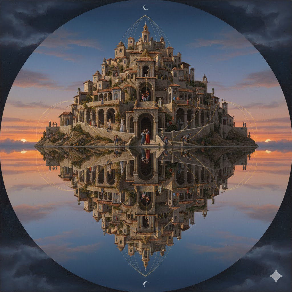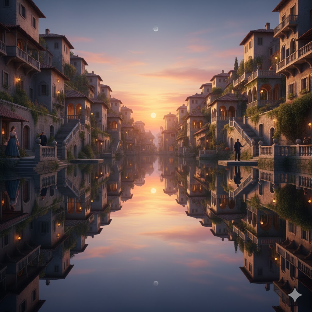 “The ancients built Valdrada on the shores of a lake, featuring houses with tiered verandas and high streets with parapets overlooking the water. Upon arrival, a traveler sees two cities: one standing erect above the lake and its identical, upside-down reflection in the water. Every detail of the city—from the juttings of the facades to the interiors of the rooms, including ceilings, floors, and even the mirrors inside wardrobes—is perfectly repeated in the lake. Consequently, the inhabitants of Valdrada are constantly aware that every action they perform is simultaneously its own mirror-image, a realization that prevents them from ever acting out of chance or forgetfulness. Whether it is the intimacy of lovers or the violence of a murder, what truly matters to them is not the act itself, but the cold and limpid reflection of that act in the mirror.