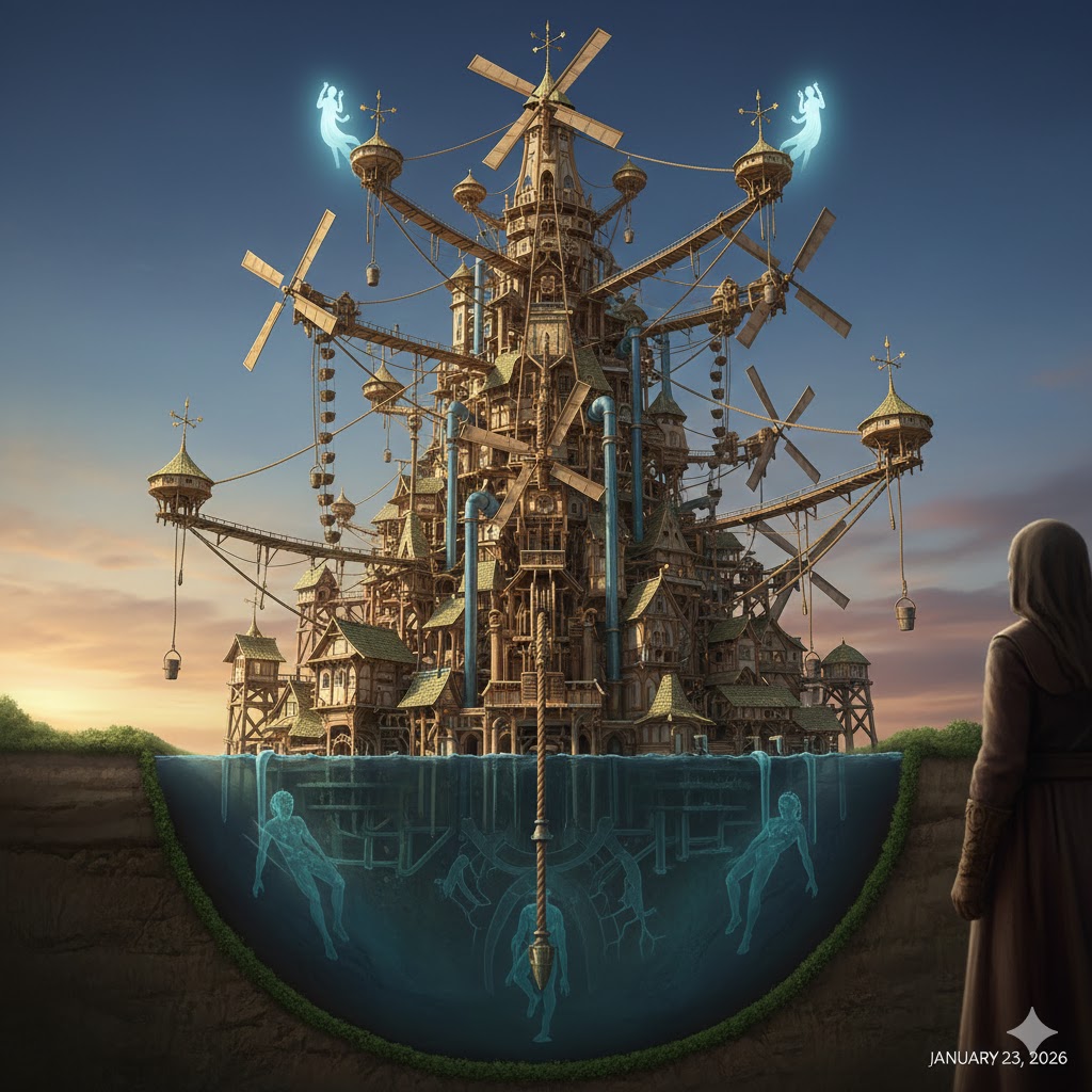 “Isaura, city of the thousand wells, is said to rise over a deep, subterranean lake. On all sides, wherever the inhabitants dig long vertical holes in the ground, they succeed in drawing up water, as far as the city extends, and no farther. Its green border repeats the dark outline of the buried lake; an invisible landscape conditions the visible one; everything that moves in the sunlight is driven by the lapping wave enclosed beneath the rock’s calcareous sky. Consequently two forms of religion exist in Isaura. The city’s gods, according to some people, live in the depths, in the black lake that feeds the underground streams. According to others, the gods live in the buckets that rise, suspended from a cable, as they appear over the edge of the wells, in the revolving pulleys, in the windlasses of the norias, in the pump handles, in the blades of the windmills that draw the water up from the drillings, in the trestles that support the twisting probes, in the reservoirs perched on stilts over the roofs, in the slender arches of the aqueducts, in all the columns of water, the vertical pipes, the plungers, the drains, all the way up to the weathercocks that surmount the airy scaffoldings of Isaura, a city that moves entirely upward.”