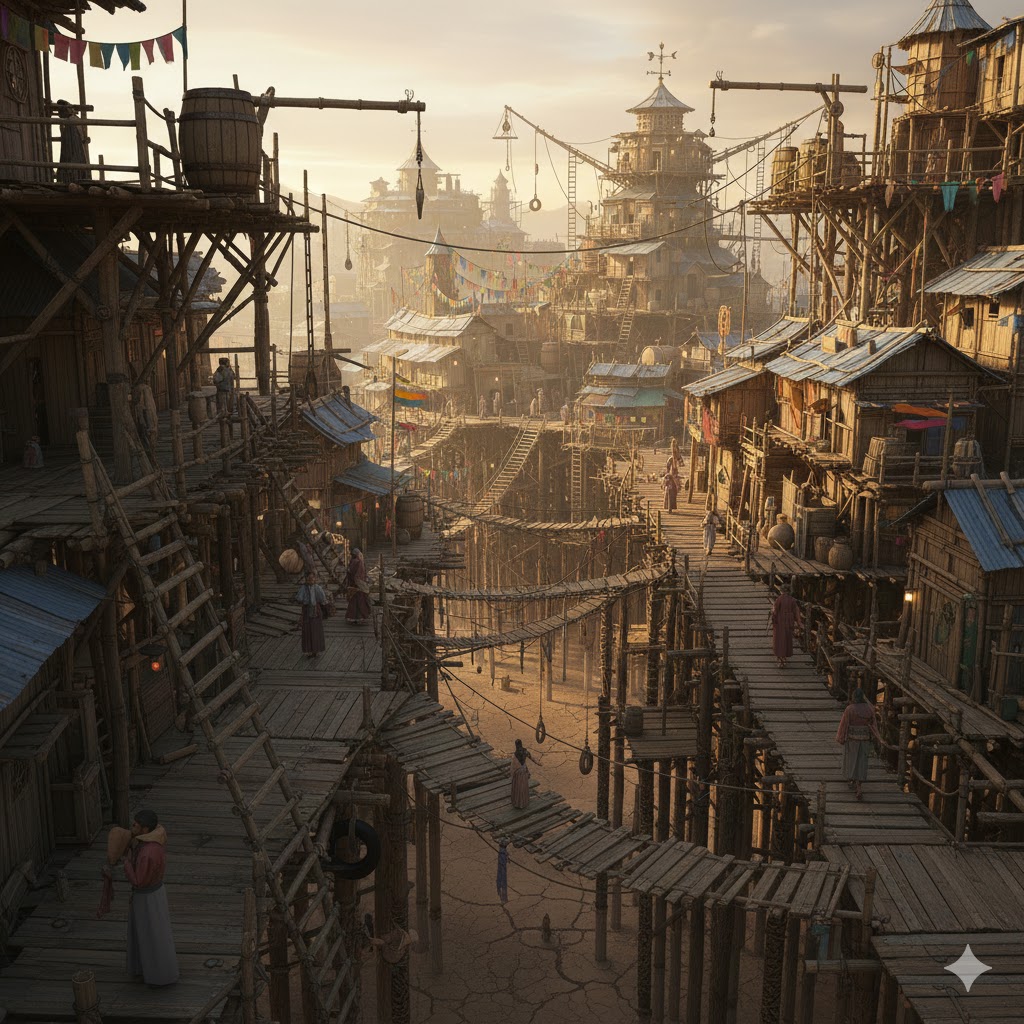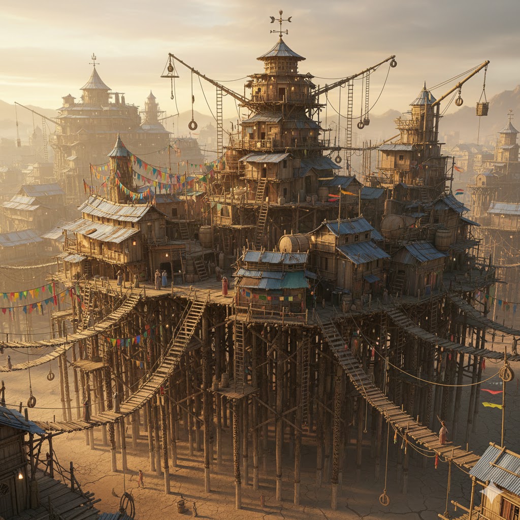 “Now I shall tell of the city of Zenobia, which is wonderful in this fashion: though set on dry terrain it stands on high pilings, and the houses are of bamboo and zinc, with many platforms and balconies placed on stilts at various heights, crossing one another, linked by ladders and hanging sidewalks, surmounted by cone-roofed belvederes, barrels storing water, weather vanes, jutting pulleys, and fish poles, and cranes.